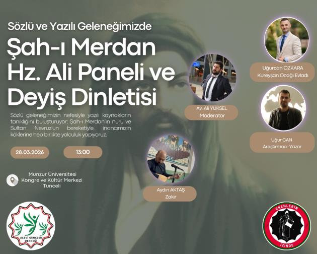 Etkinliğin ilk bölümü, saat 13:00’te Munzur Üniversitesi Kongre ve Kültür Merkezi’nde başlayacak. "Sözlü ve Yazılı Geleneğimizde Şah-ı Merdan Hz. Ali" başlığıyla düzenlenecek olan panelde, Hz. Ali’nin tarihsel ve inançsal boyutu genç isimler tarafından ele alınacak. Panel programı, kültürel mirası notalara döken bir deyiş dinletisiyle taçlanacak.